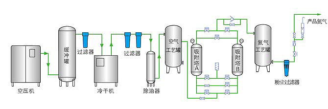 由空氣緩沖罐及附屬閥門儀表組成。空氣緩沖罐是降低氣流脈動,起緩沖作用;從而減少系統(tǒng)壓力的波動,使壓縮空氣能平穩(wěn)地通過壓縮空氣凈化組件以便充除去油、水、塵等雜質(zhì),減少了氧氮分離系統(tǒng)的負荷。同時,也為氧氮分離系統(tǒng)在進行吸附塔工作切換時,提供短時間內(nèi)迅速升壓所需的大量壓縮空氣,不僅使而咐附內(nèi)壓力很快上升到工作壓力,而且還保證了設備可靠穩(wěn)定的運行。